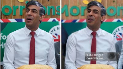 But, a picture of the Sunak appearing to meet Morrisons employees on the campaign trail with the word 'moron' spelled out behind him was actually edited.
